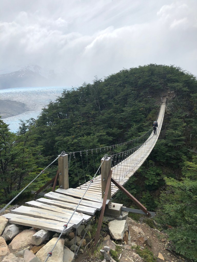 The following day we planned on doing a small one-night backpacking trip on the southern arm of the W-trek. We wanted to hike to Gray Glacier and two suspension bridges but to do this in one day required taking a ferry to the trailhead, hiking 12 miles to the bridges and hiking the 12 miles back in time to take the ferry back. We decided this was too much for one day and instead booked a campsite at the glacier to split the hike in two. The first day we took the ferry and completed the first 12 miles arriving at Gray Glacier and the two suspension bridges. The view of the glacier was spectacular! The ice was beautiful due to numerous shades of blues against the murky gray color of the lake. This glacier is part of the third largest ice sheet in the world only dwarfed by Antarctica and the Greenland ice sheet. The two bridges were also a sight to see! Both were narrow wooden suspension bridges that spanned a considerably long and deep gap! The combination of a sign saying a 4-person maximum on the bridge and the wind swaying the bridges, made crossing the bridges a nerve-racking but exciting experience! We spent that night peacefully sleeping in our tent surrounded by a hundred or so other tents. In the morning we woke up early to get a head start on our hike back down. We made it back down in time to catch the 11:00 am ferry back to our truck. We were very happy with our decision to split this hike in two. We would not have been able to hike the 24 miles in one day and enjoy the experience. Once back at the car, we had finished all our planned hikes for Torres del Paine so we drove back to Puerto Natales for a much deserved shower and hot dinner! We slept that night near the border since our destination for the next day was the town of El Calafate in Argentina.