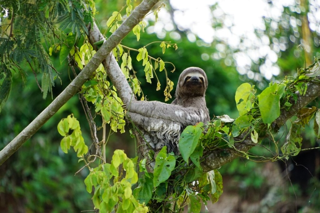 But any discomfort from the heat was quickly forgotten as the wildlife spotting began. Carlos, with his eagle eyes, pointed out birds that we would have completely missed – brilliant toucans, colorful macaws flying in pairs overhead, and herons standing statue-still along the riverbanks. About an hour into our journey, we slowed down as Carlos gestured toward what looked like just another tree branch. There, perfectly camouflaged, was a three-toed sloth, so still you might mistake it for part of the tree itself.